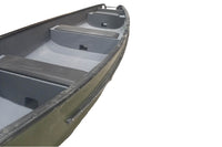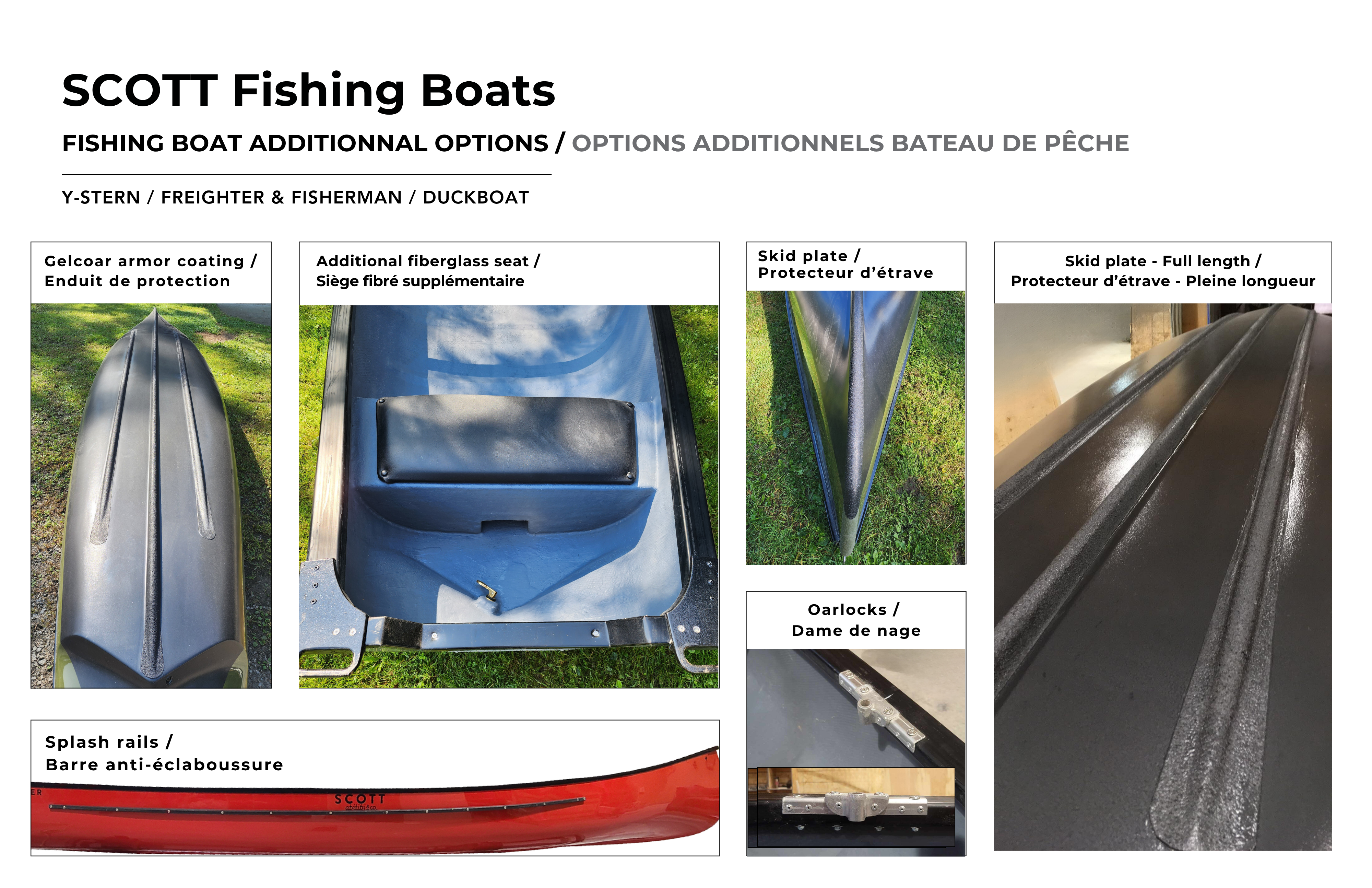 Basic features include heavy-duty laminate, three keels reinforced with aluminum tubing, a minimum of eight heavy-duty braces, a moulded aluminum bow, integrated handle ends, gunwales and extra-wide ash rails. The rear seat, made of solid wood and covered in fiberglass, also includes flotation materials. It also comes with a solid central bench of the same composition.